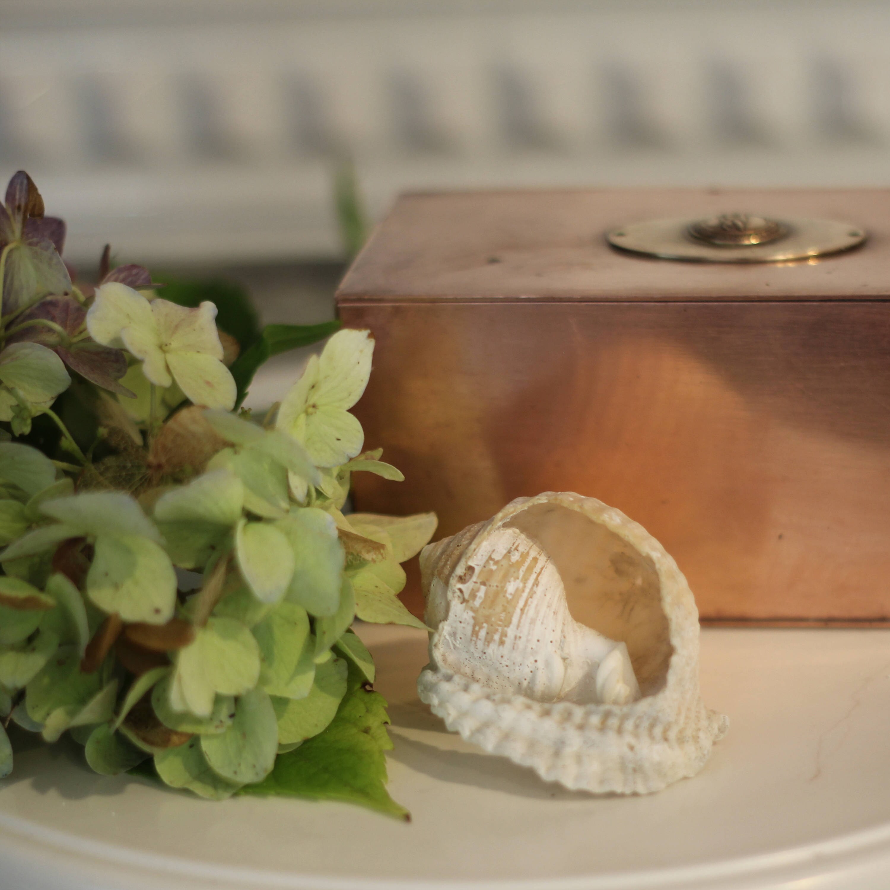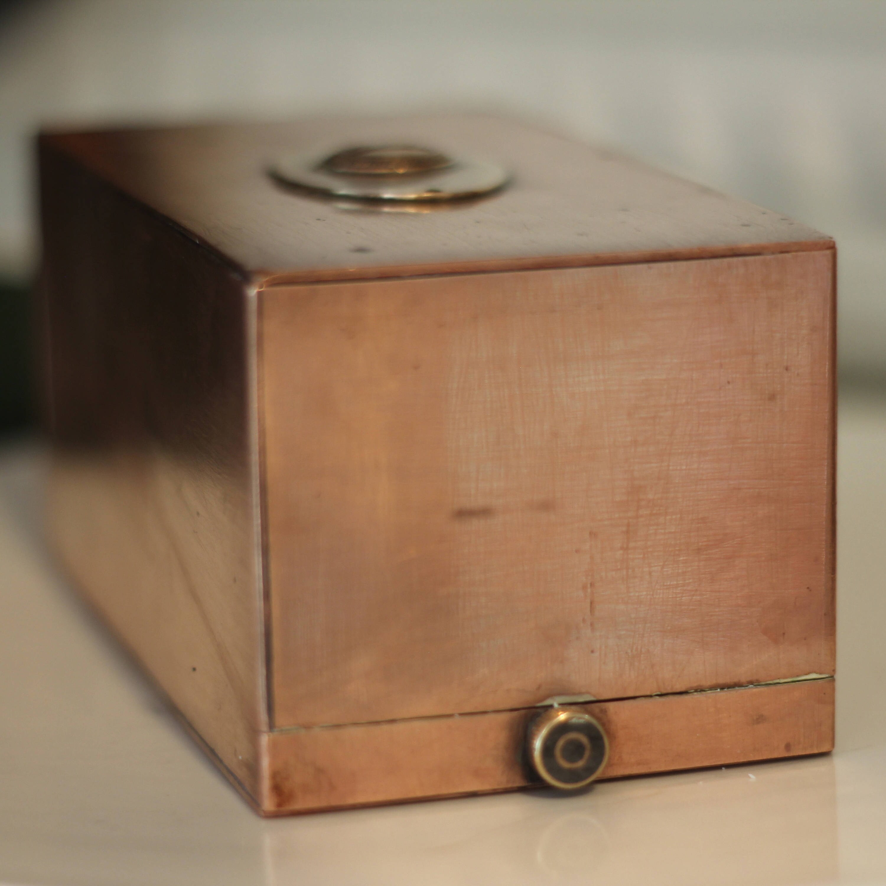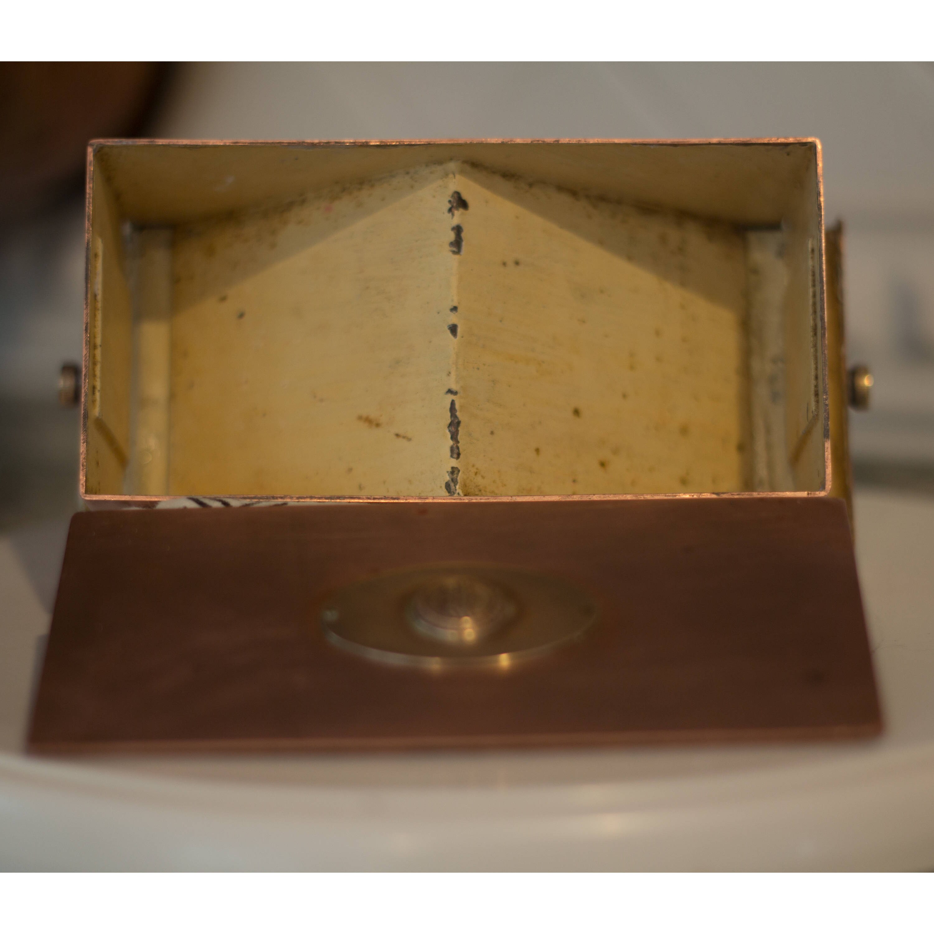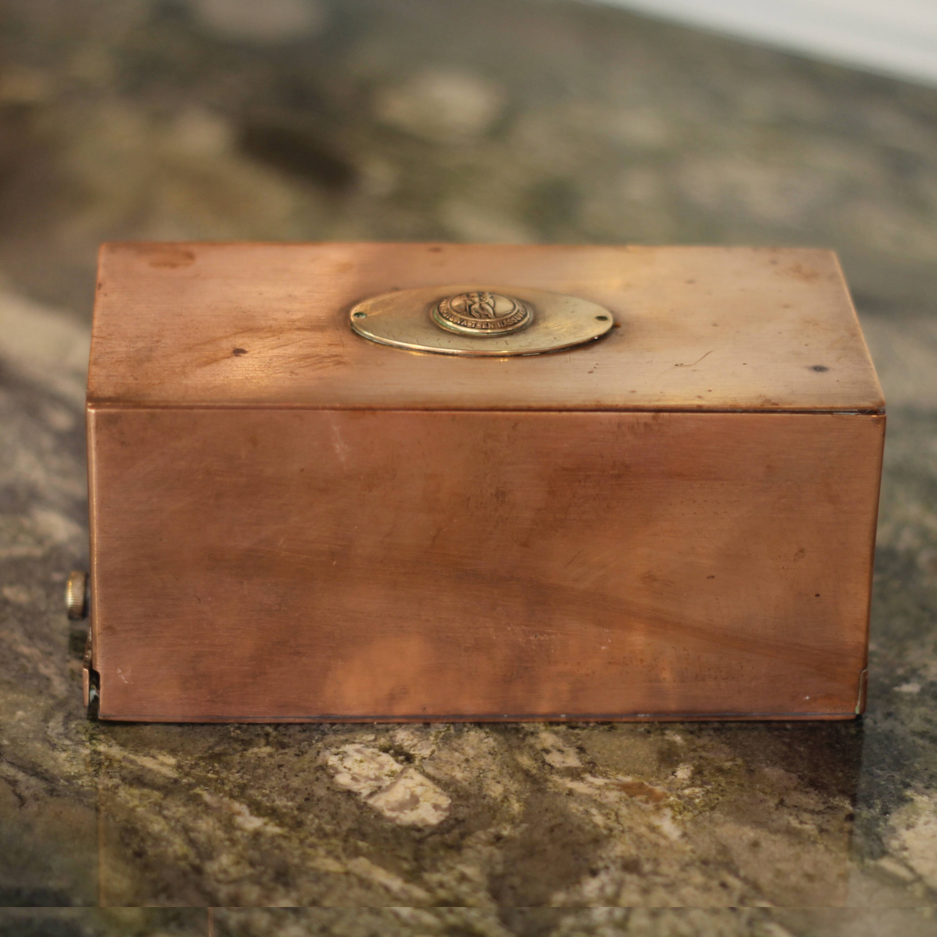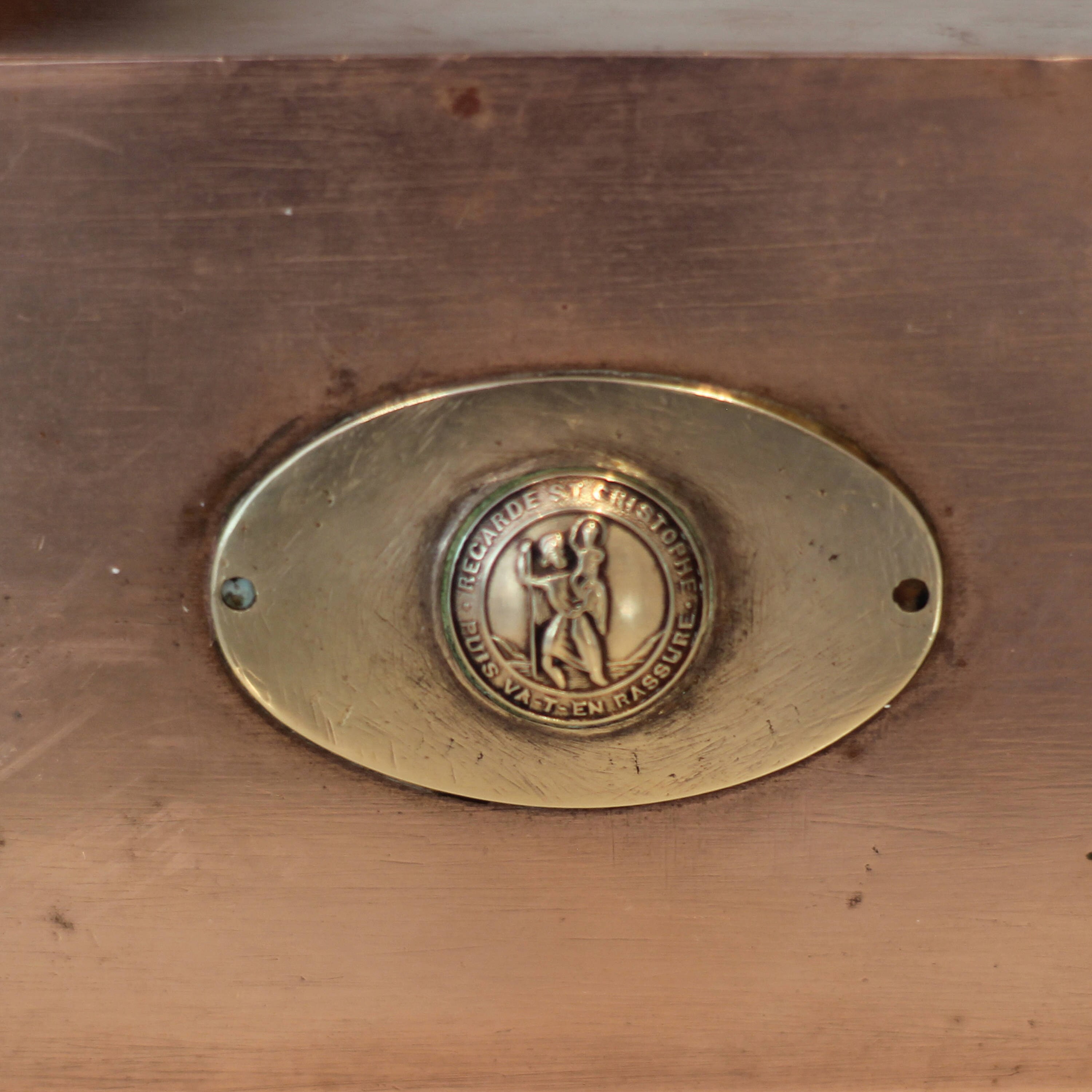 It made using heavy copper sheeting, the top medallion and the drawer pulls are brass. The interior is partially made with another metal (unknown) and painted cream. There is wear to the inside paint. The top has a brass medallion with what I assume is a depiction of Saint Christopher. The wording reads “Regarde St. Christoph puis va t’en rassure” and translates from the French to "Look at St. Christopher and go on reassured”