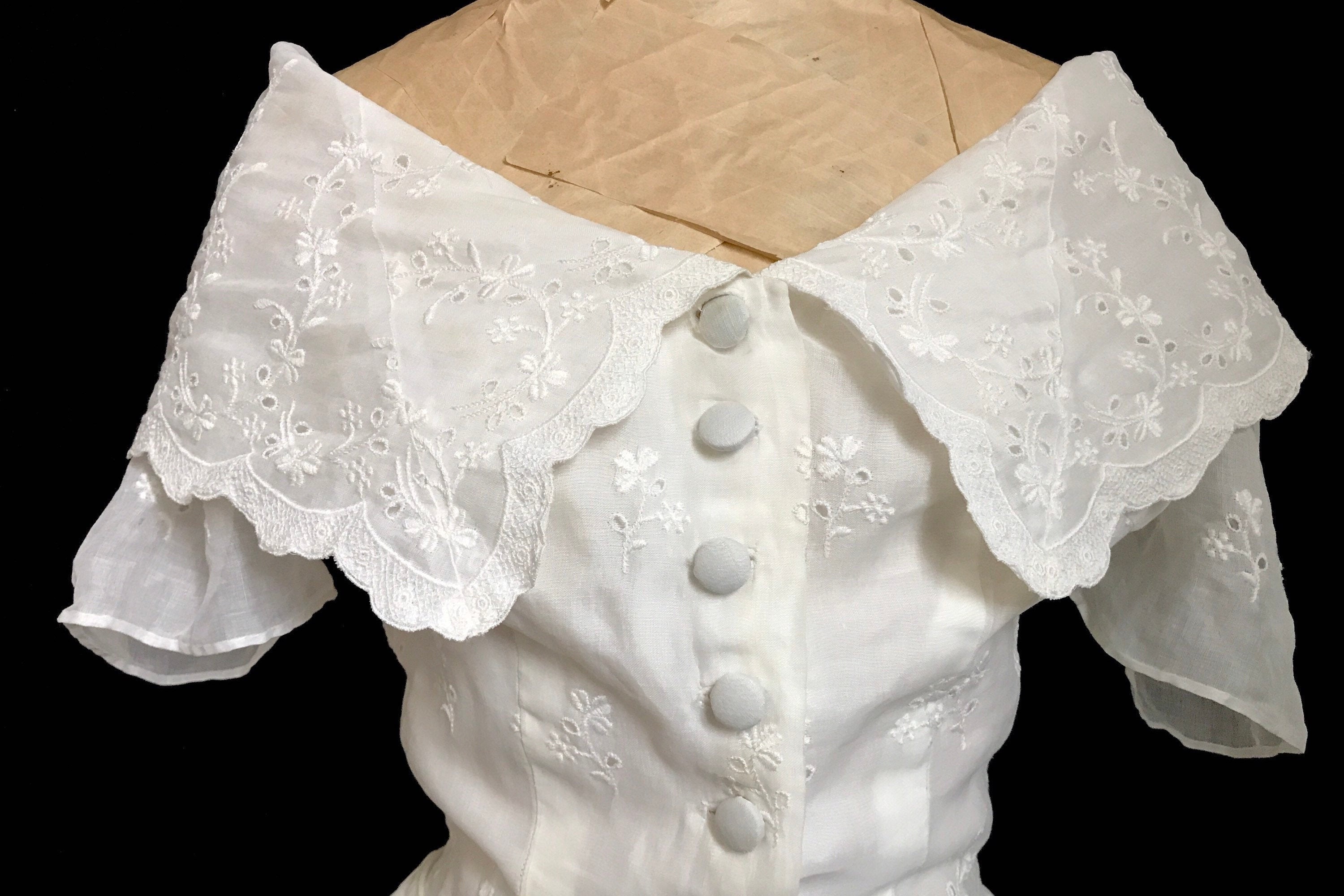 VTG MCM Wedding Dress White Organdy Broderie Anglaise Tea Length Eyelet Summer Spring XS